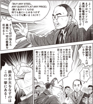 第一次世界大戦開戦3か月後の大正3(1914)年11月、大戦勃発を最大の好機と見た鈴木商店本店の金子直吉からロンドン支店の高畑誠一達に宛てた電報により「BUY ANY STEEL,ANY QUANTITY,AT ANY PRICE」(鉄と名のつくものは何でも金に糸目をつけず、いくらでも買いまくれ)という大号令が発せられました。(右のマンガの場面をご覧下さい)