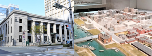 神戸市立博物館の外観と鈴木商店本店だった建物が確認できるジオラマ