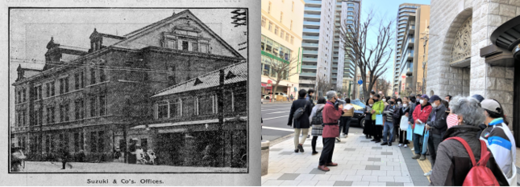※この度の "まち歩き" に先立ち、神戸市行財政局業務改革課より栄町通4丁目の鈴木商店跡地に関する貴重な資料をご提供いただき、長年不明確であった同店の場所が特定できたことは、当記念館にとって大きな発見でした。