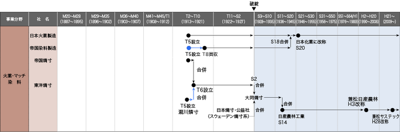 その後、鈴木商店破綻後の昭和3(1928)年、日本火薬製造は、帝国染料製造を系列化し、昭和18(1943)年には帝国染料製造、山川製薬を吸収合併して、火薬、染料、医薬の3事業を擁する総合化学メーカーとなり、日本化薬に商号変更し、現在では、機能化学品事業、医薬事業、セイフティシステムズ事業、アグロ事業の4事業を展開する。