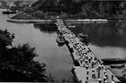 戦時中、造船所では2万名を越える人々が働いており、工員を円滑に移動させよという海軍の要請により架橋を断行し昭和18(1943)年6月18日、甲崎の北端と対岸の松の浦とを結ぶ海上距離208メートル余の間に幅7.5メートル、長さ15メートルのポンツーン(箱舟)を10個並べた大桟橋が完成した。桟橋は、この計画の実現に終始尽力した海軍監督官の岸大佐により「皆勤橋」と命名された。