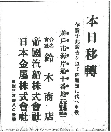 検索結果へ戻る 写真を検索する 鈴木商店写真館 鈴木商店移転広告(大正9年) 鈴木商店移転広告(大正9年) 地域特集>神戸(中心部) 企業特集>海運 ご協力企業>東邦金属株式会社 帝国汽船, 広告, 日本金属, 東邦金属, 海運, 神戸(中心部)