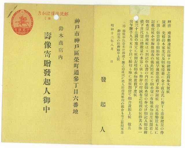 検索結果へ戻る 写真を検索する 鈴木商店写真館 鈴木商店創業関係者壽像頒布通知 創業者・鈴木岩治郎、よね、金子直吉の小型胸像の頒布通知。各一基37円で頒布する旨、鈴木商店内「壽像寄贈発起人」名義で出された。(昭和12年8月)