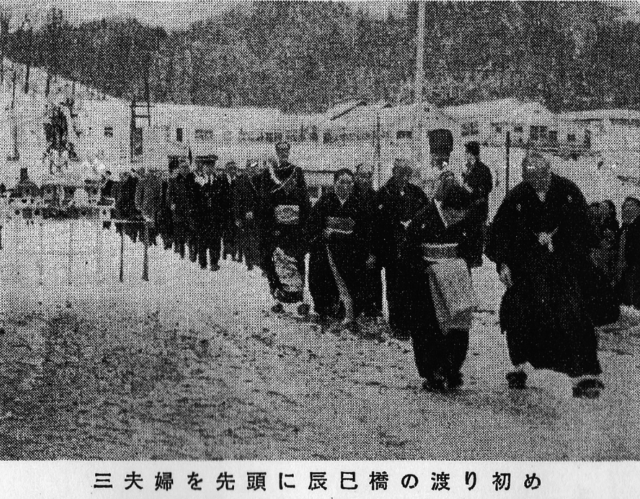 検索結果へ戻る 写真を検索する 鈴木商店写真館 辰巳橋の渡り初め(羽幌炭砿の社報:昭和38年12月2日付「石炭羽幌」より) 築別炭砿駅を降りて炭鉱の中心部へ向かう時、人々は必ずこの橋を渡らなければならなかった。すなわち、築別炭砿事務所方面に通じるメインストリートの途中に築別川が流れており、そこに架かる橋が「辰巳橋」である。橋の名称は、かつて鈴木商店の先代・鈴木岩治郎が番頭として働きその後鈴木商店が暖簾を譲り受けた「辰巳屋」に由来する。鉱員が炭坑に入るために使用する橋であり、住民が役場支所、消防本部、会館、クラブ、配給所、生協、大五百貨店、映画館、スキー場、ジャンプ台、さらには大山祇神社への参拝、お祭りの出店、花火大会、などに行くためには必ず通る、生活に密着したなくてはならない橋であった。辰巳橋は羽幌炭砿創業期の昭和16(1941)年に架設された。その後昭和31(1956)年に架け換えられたが幅員4.5㍍とあって大型バス、トラックの通行は幅ギリギリ一杯で通行量も急増していたことから架け替え工事を行い、昭和38(1963)年11月、住民のだれもが待ち望んでいた幅員9㍍(内「人道」3㍍)、全長37㍍の鉄筋コンクリート造りのスマートな永久橋が完成した。同年11月29日、橋の前で関係者200名が参列して竣工式が行われ、その後炭鉱創業前から当地に住んでおられたご夫婦3組が神官に先導され、太陽中学校のブラスバンド、幼稚園児170名のうち振る日の丸の小旗の中、渡り初めが盛大に行われた。 鈴木商店の歴史>金子直吉のお家再興に向けて 地域特集>羽幌 企業特集>炭鉱 炭鉱, 築別炭砿, 羽幌, 金子直吉のお家再興に向けて