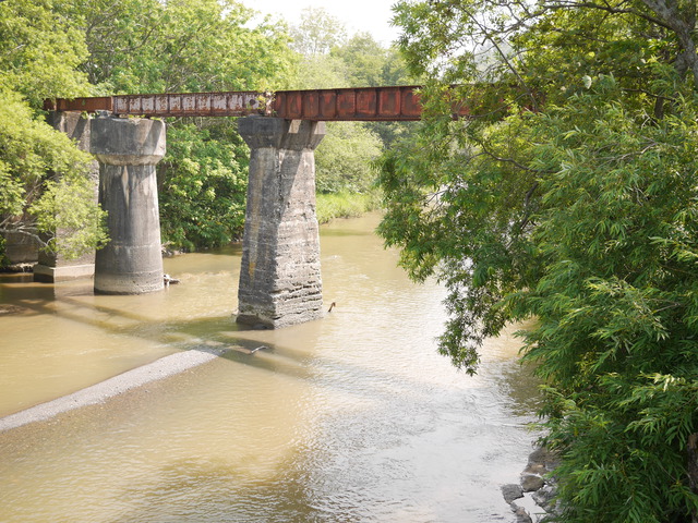 検索結果へ戻る 写真を検索する 鈴木商店写真館 第三橋梁の径間が不揃いであることにも注目(平成26年7月) 築別駅を出発した羽幌炭砿鉄道の列車が、3番目に渡る橋である。第三橋梁は橋桁に加えて橋脚にも不自然さが目立つ。まず橋桁であるが、異なる二つの橋桁が連結されており、勤倹橋から眺めると向かって右側の橋桁の方が左側に比べて縦幅が長い。さらに、右側の橋桁の色が赤系なのに対し、左側は白系である。次に橋脚であるが、明らかに径間(各橋脚の間隔)が不揃いであることが分かる。戦時下における建設資材の調達難を、今に伝える橋梁の姿である。 鈴木商店の歴史>金子直吉のお家再興に向けて 地域特集>羽幌 企業特集>炭鉱 炭鉱, 羽幌, 金子直吉のお家再興に向けて