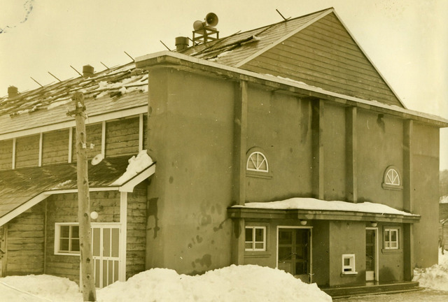 検索結果へ戻る 写真を検索する 鈴木商店写真館 本坑会館(昭和27年頃) 昭和25(1950)年に起こった労働争議(1か月におよぶストライキ)を最後に、羽幌炭砿は労使一体となって本格的な合理化と技術革新によりコストダウンをはかるとともに、出炭量の増加に邁進して行った。炭砿の発展とともに、住居、文教施設、体育施設などの福利厚生面も徐々に充実していった。さらに、会社は従業員や家族の慰労にも力を入れるようになった。これに伴い、人々の生活にも余裕ができ映画、観劇、音楽、スポーツなどが楽しめるようになった。このような状況の中、昭和27(1952)年に築別炭砿に「築炭会館」が完成した。それまでの会館とは名ばかりの建物から一転、都会の劇場・映画館と変わらない近代的な施設の誕生であった。会社の記念行事、炭砿(ヤマ)の各芸能グループの発表会、講演会なども行われ、ヤマの「娯楽の殿堂」、「文化の殿堂」とも言える存在になった。時をほぼ同じくして羽幌本坑には「本坑会館」が建設された。場所は炭砿住宅の中心地である睦美町に位置し、映画の上映を中心に人々の憩いの場となった。 鈴木商店の歴史>金子直吉のお家再興に向けて 地域特集>羽幌 企業特集>炭鉱 炭鉱, 羽幌, 羽幌本坑, 金子直吉のお家再興に向けて