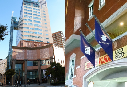 6公演はいずれも満席という盛況ぶりで、迫力に満ちた講談会は大好評裡に終了しました。(上の写真左は会場の「神戸新聞 松方ホール」、右は和田興産(株)が作成し同じく会場の「WADAホール」の建物の前面に掲げられた①鈴木商店の商標「カネ辰」と②鈴木よねの名前の"米"を象った星形のマーク「よね星」をデザインした2本の旗です)