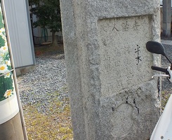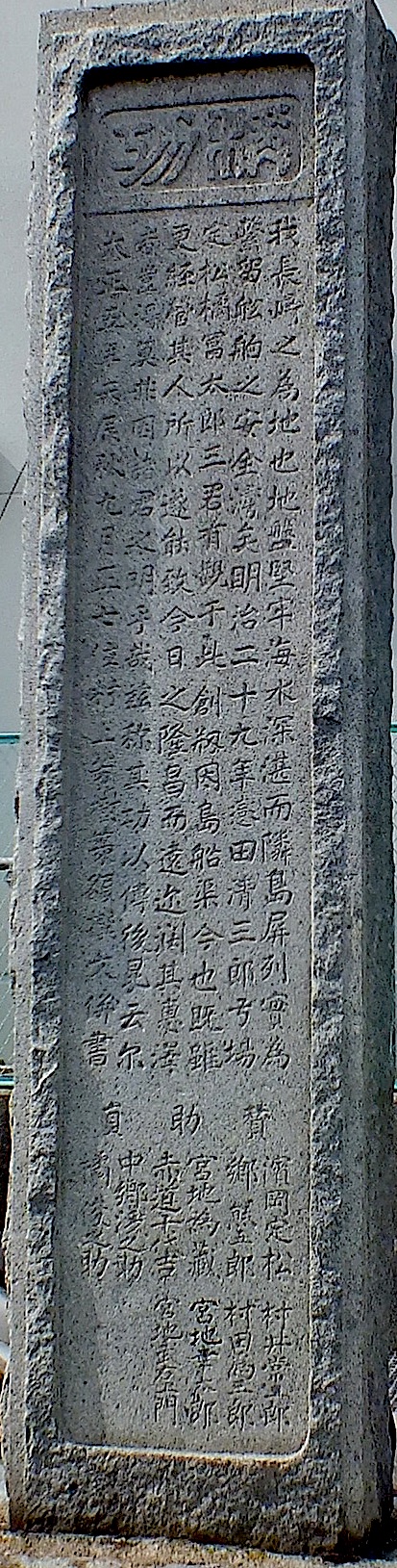 大正5(1916)年9月、浜岡定松ほか地元民10人の賛助者により記念碑が建てられた。因島船渠は、明治29年(土生(はぶ))村の船大工・橘富太郎が地元の有力者の恋田清三郎、弓場定松の協力を得て設立したことが記されている。