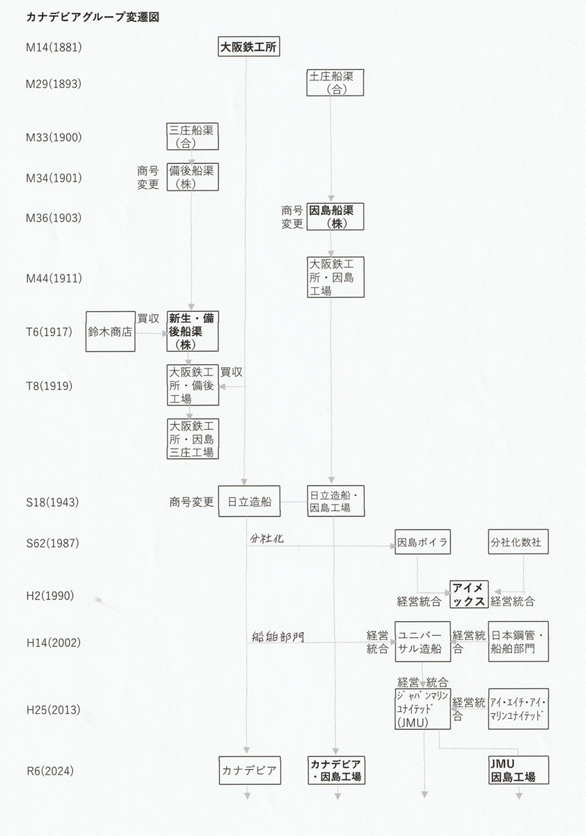 沿革:平成14(2002)年、船舶部門を分離し日本鋼管・船舶部門と統合して"ユニバーサル造船"が誕生、船舶部門以外の日立造船は、令和6(2024)年社名を「カナデビア」に変更。